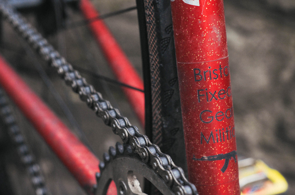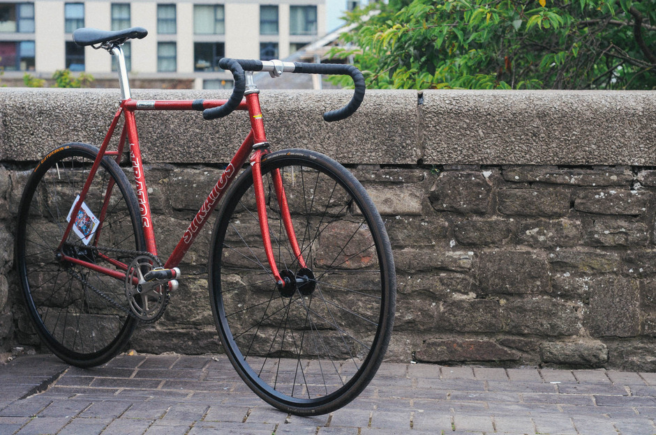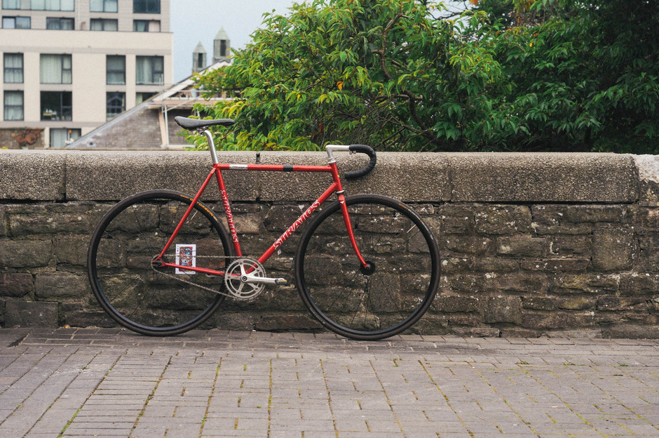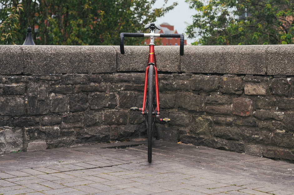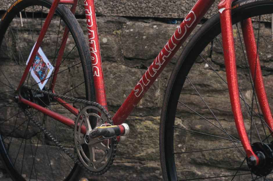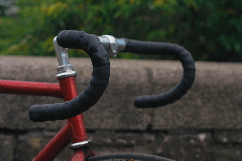 I scratched the NJS Track bike itch around summer 2014 with this beautiful candy red Stratos bought straight from NJS Export in Japan. It arrived wrapped in Japanese newspapers and with the charictatistic dent in the top tube which meant it couldn’t be used in competition any more. NJS frame are written off for racing once they’ve taken a hit so a lot end up in the second hand market for discerning fixed gear wankers like myself. Notice the wrap of black tape around the top tube protecting the dented area from further damage.