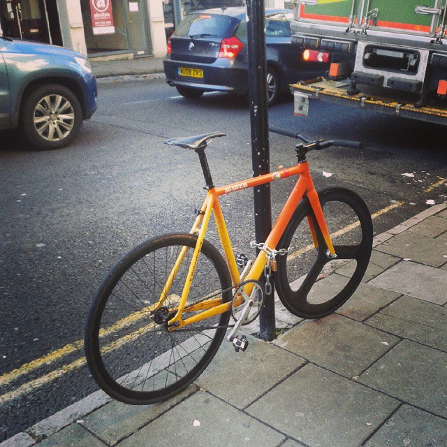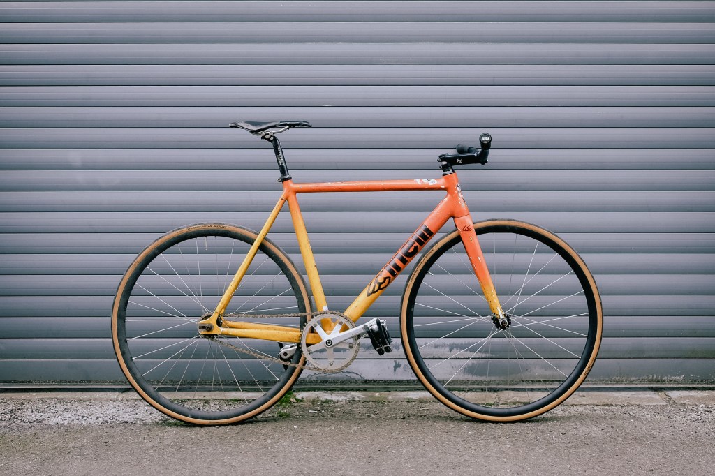 This was one of the first batch of Cinelli Mash Parallax frames to arrive in the UK way back in 2014. Despite hating the paint job I loved the shape and angles of this frame and knew I had to get my hands on one. I was working Saturdays in Bristol Dropouts at the time, and got a trade price deal on the frame as payment for quite a few days work. The day the frame arrived I took it home, bought a few cans of paint, and Gave Gabe a beer and a frozen pizza in exchange for spraying a wicked sunset fade over it. I later drew the logos back on with a sharpie. At the time I’d not have expected to be riding it 9 years later. or for the paint to be holding up so well.