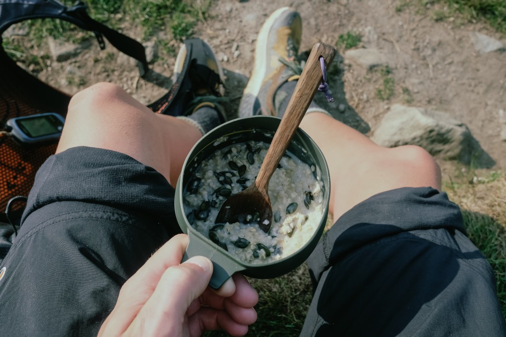 I slept in later on day 3 and walked for an hour before stopping for my rocket fuel breakfast: porridge with powdered coconut milk, cashews, pumpkin seeds and brown sugar. This works well for me and is easy to portion into freezer bags before starting out. Day 3 was more varied and made for much easier progress than Loch Lomond as it mostly followed old military roads, winding through the forest near Crianlarich and towards Tyndrum.