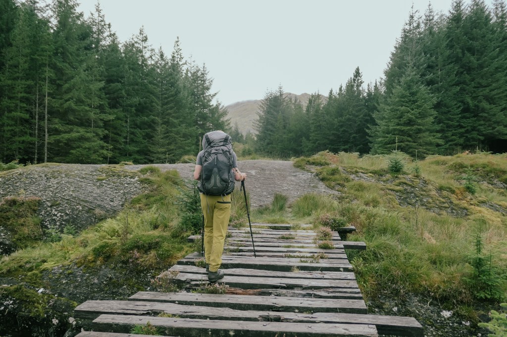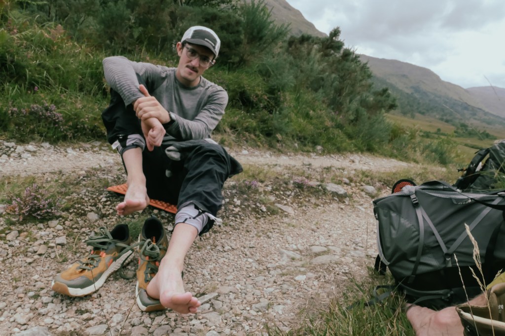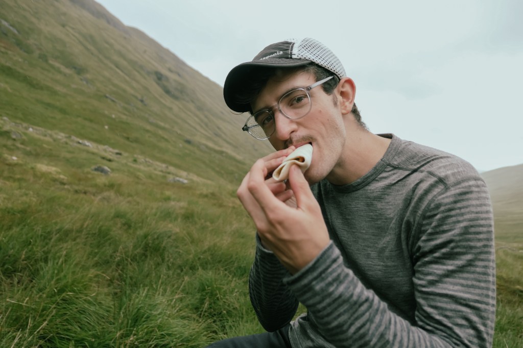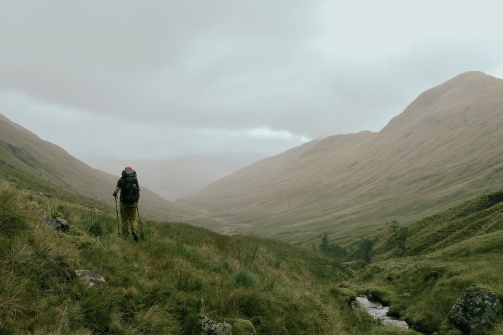 Things really got going today, and the trail gifted us our first taste of more remote and challenging terrain. The descent from the bealach above Corryhully was steep, boggy, and pathless, I’ve opted to wear trail runners for this trip rather than boots with the thinking being that they’ll be kinder to wet feet, and wet feet are inevitable. Ayoob has gone for the opposite approach of sturdy boots and gaitors to keep the water out. Today was the first real test of my wet shoe approach and thankfully seemed to work out alright, although I coudn’t shake the fear of picking up a blister, which had the potential to be trip ending.
