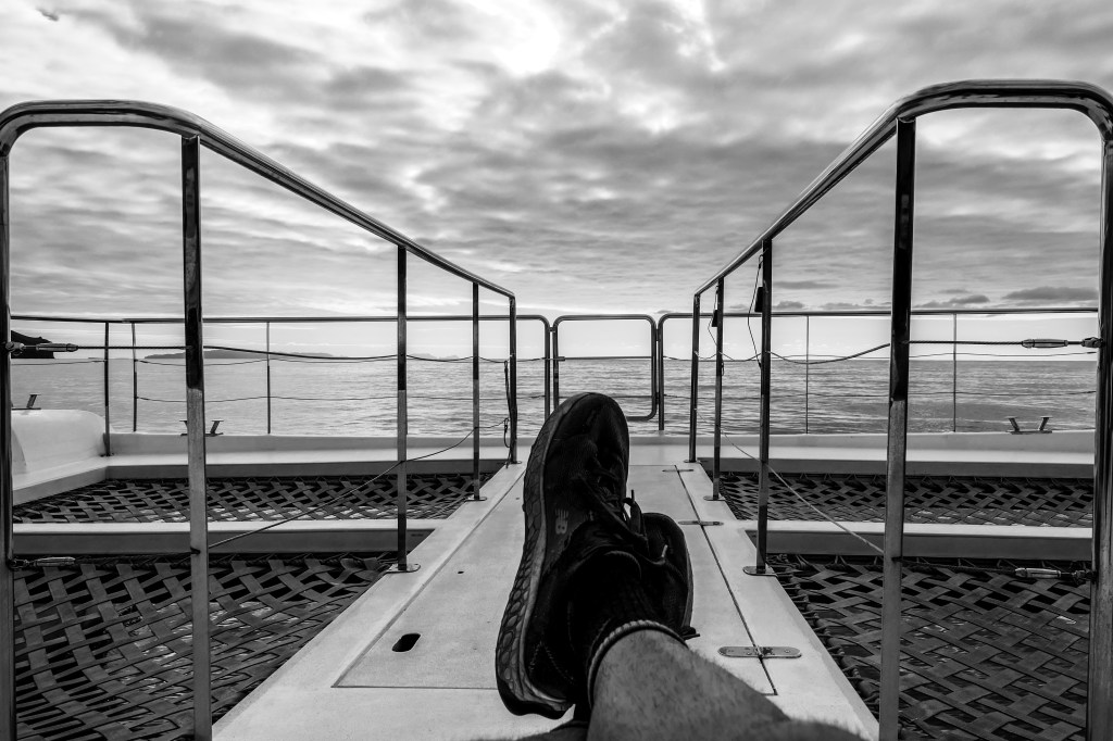 We didn’t pick specific seats on the plane, because where is the fun in that? Our allocated seats end up being the two rows at the back, which we have all to ourselves. I spend a moment considering the environmental impact of a ‘not full’ aircraft, and then stretch out and drift off to sleep accompanied by Neil Young’s ‘Comes A Time’. Dad rock is my lullaby.