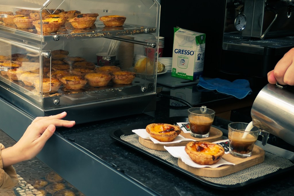 On reaching the self-service checkout everything goes to shit. We haven’t labelled the veg, the self-checkout flags up an error, I’ve stuck the label for a pastry onto a courgette by mistake. Neither of us speak Portuguese to explain. I find this all quite fun.