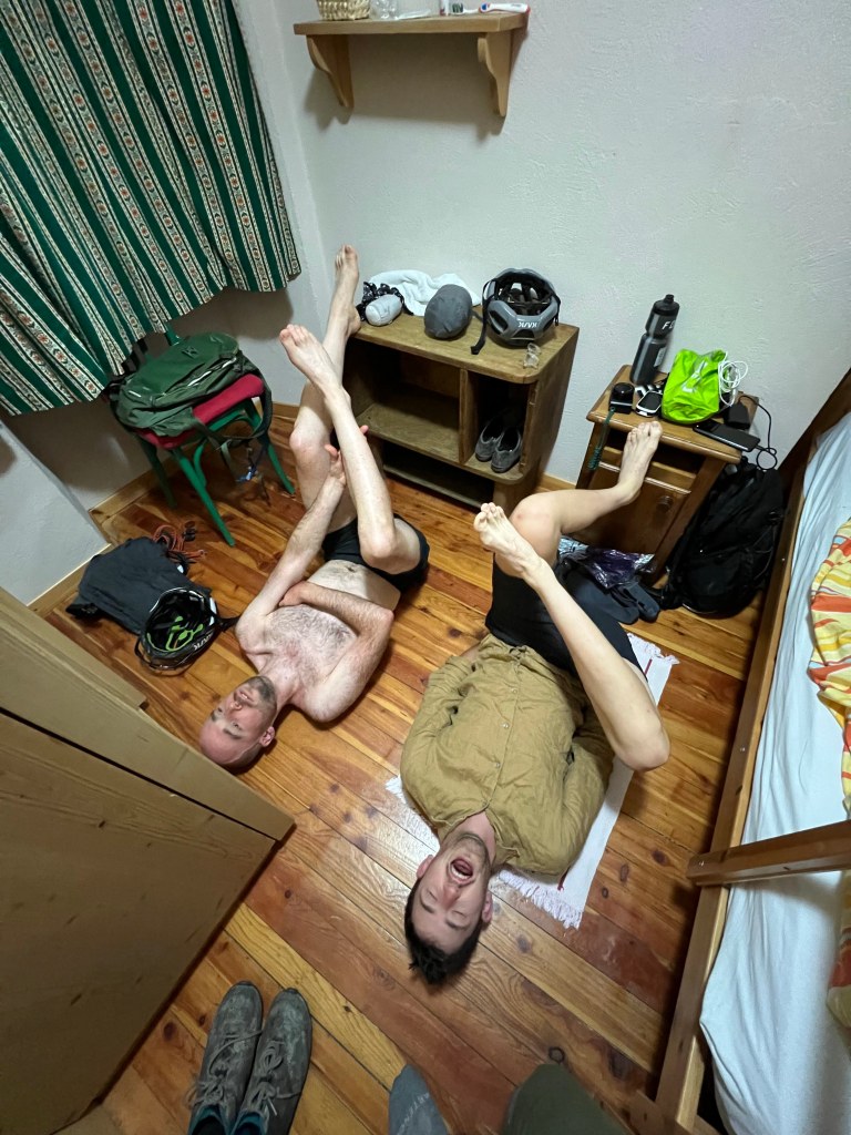 After dinner, we retreated to our room well-fed, completely wiped out, and desperate for some shut-eye. Andrew and I thought about doing some stretching. but instead led on the floor chatting for 10 minutes and then gave up. The others washed their kit, but I decided to hang mine in the cupboard and not worry about it. I really hate putting damp kit on in the morning and would rather smell a bit funky. Unfortunately for him, Ayoob has a keener sense of smell than I do and was unimpressed by this approach, which only made me want to continue it further and push the boundaries of unwashed lycra stench.