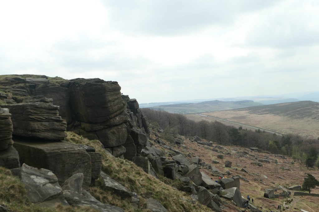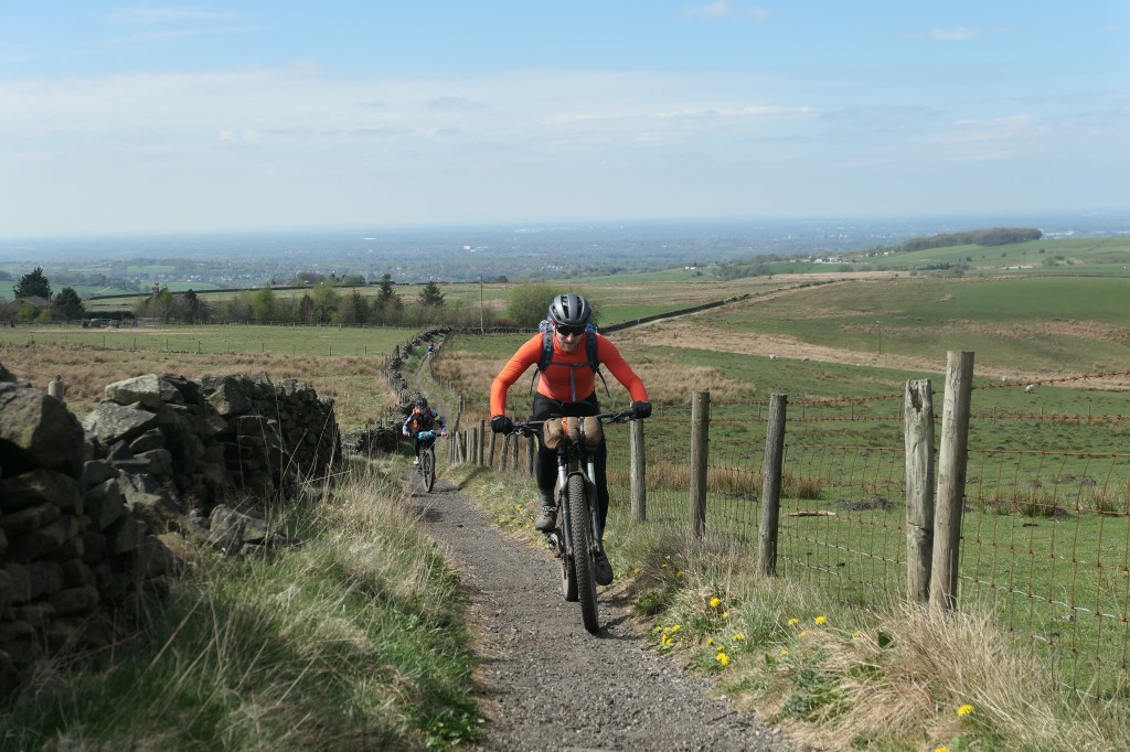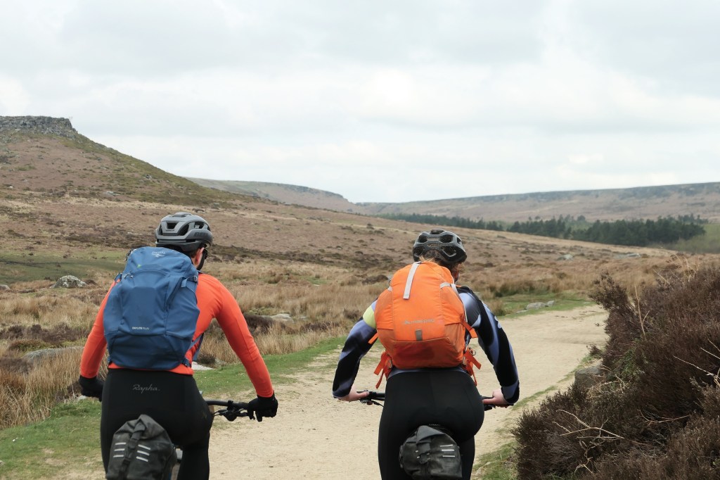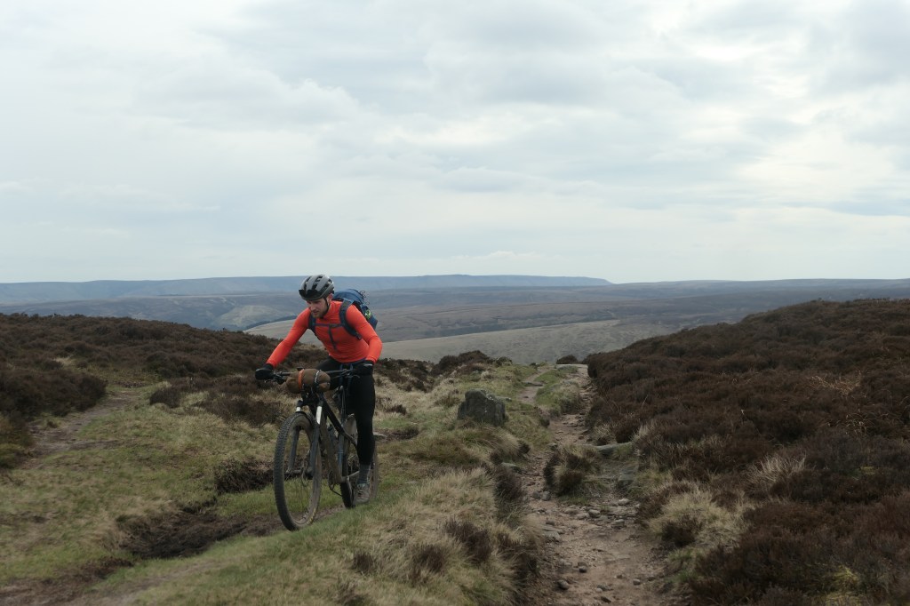 Despite being mostly ridable there were a handful of hike-a-bike sections on the route. Some of which may or may not be ridable by the right riders in the right conditions. I did my best to try and pedal these and was thriving on the grippy sandstone rocks. It felt like you could push much harder before the tyre would slip or spin out, and having a bag on the bars helped to keep the front wheel from wandering on the steepest bits. I was pushing as hard as I could to get up the path onto Stanage Edge, repeatedly cleaning sections I thought might get the better of me, up and over big rocks on a crazy gradient. I finally gave in on one huge step only to look behind me and get a round of cheers from a bunch of rock climbers who’d stopped to watch. They were in amazement that I wasn’t on an E-bike. I’d had no idea they were watching but Ayoob said they’d loved it. I’ll try not to let this go to my head, but It felt fun to have put on a show.