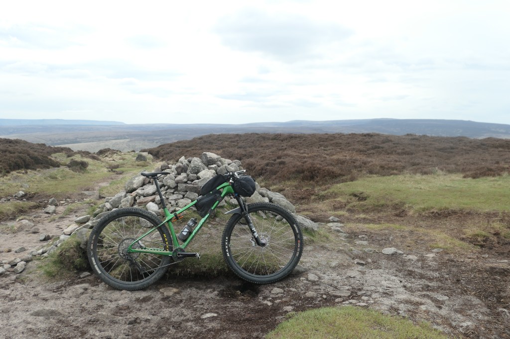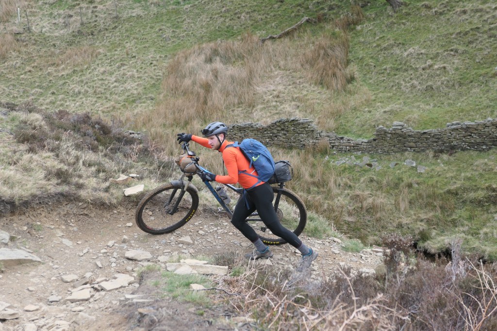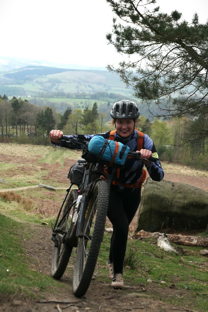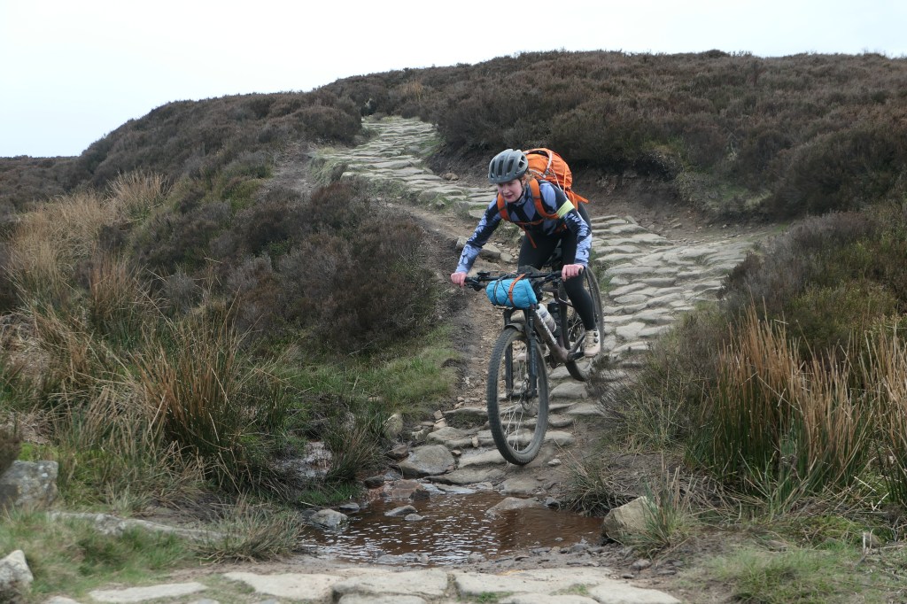 We descended for a while and skirted around the shores of Ladybower, Derwent, and Howden reservoirs before tackling the final climb of the day which took us up and over Cut Gate, a well known peaks mountainbike route often ridden as an out and back. The climb from South to North was ruthless, some hiking was required, and what was could be pedalled was bloody hard. As is usually the case the reward was very much worth the effort. Winding singletrack back down the hill for what felt like forever, with some peaty loamy sections, techy rocks, and more manicured slab paved bits. Freya led us into this descent and I was struck by how well she was riding, she’s only been regularly into the mountainbike for about a year but has been putting the hours in and reaping the rewards and progressing at a crazy rate. Rocky, technical descent on an XC hardtail with bikepacking gear after a whole day on the pedals? no problem at all.